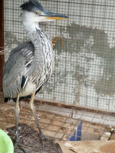經(jīng)有經(jīng)驗的民警辨認,這是一只蒼鷺幼鳥。這只鳥身高約70公分,長長的尖嘴,身著灰色體羽,頭戴深灰色羽冠,兩條大長腿格外顯眼,白色的前頸縱向排列著黑灰色條紋。民警聯(lián)系獸醫(yī)為其做了體檢,經(jīng)檢查,這只鳥并無傷病,可能是由于剛出窩飛行能力不強、捕食能力不足,造成體力虛弱。民警買來小魚,只見這只鳥狼吞虎咽享用起來,不久便精神十足,開始啄民警。看到它體力開始恢復,民警懸著的心也就放下了。民警計劃選擇合適時間和地方將其放飛。