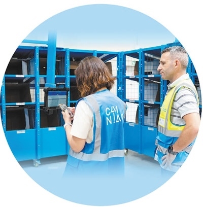 在菜鳥西班牙海外倉,兩名工作人員正在使用菜鳥自主研發(fā)的智能分揀柜系統(tǒng)進(jìn)行包裹分揀。 本報西班牙分社 大衛(wèi)·阿瑪爾攝