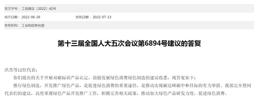 在答復(fù)中,工信部表示,推行綠色制造,開發(fā)推廣綠色產(chǎn)品,是促進綠色消費的重要途徑,是推動實現(xiàn)碳達峰碳中和目標(biāo)的有力舉措。工信部完全贊同代表們的建議,高度重視綠色產(chǎn)品開發(fā)推廣工作,積極完善相關(guān)政策,推動加大綠色產(chǎn)品研發(fā)力度,促進綠色消費。