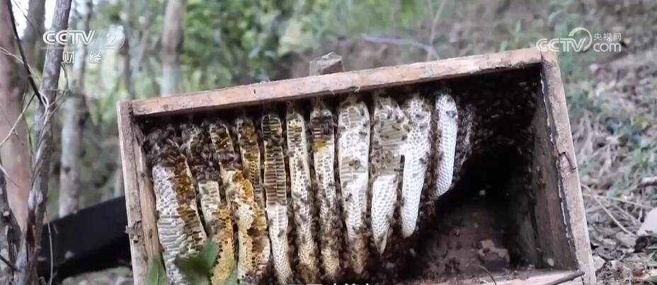 在廣西隆林各族自治縣金鐘山鄉(xiāng)弄八村養(yǎng)蜂基地記者看到,郁郁蔥蔥的森林里蜂箱錯(cuò)落有致,成群的蜜蜂交織飛舞,蜂農(nóng)正戴著防蜂帽收割蜂蜜。
