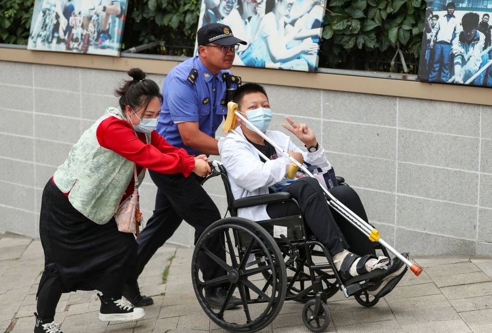 ↑6月7日,在哈爾濱市第三中學(xué)考點,一名腳部受傷的考生在工作人員攙扶下走出考場。
