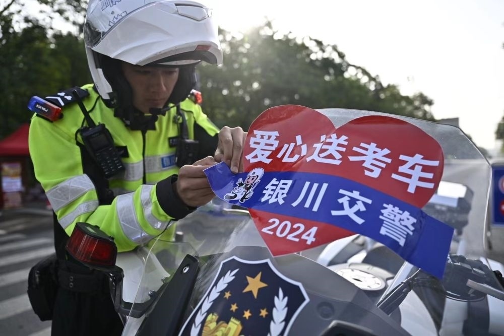↑6月7日,寧夏銀川市公安局交通警察分局興慶區(qū)交警一大隊民警在準備愛心送考車輛。