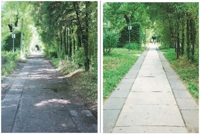 左圖:保護(hù)項(xiàng)目對(duì)燕南園水泥路修復(fù)前的景象。右圖:保護(hù)項(xiàng)目對(duì)燕南園水泥路進(jìn)行修復(fù)后的效果。燕南園保存下來的水泥路以“脫漿彩石混凝土”工藝進(jìn)行施工,老校友稱之為“洋灰路”。這里的“洋灰路”已有76年歷史,大部分仍能正常使用。北大建筑與景觀設(shè)計(jì)學(xué)院的李迪華老師發(fā)現(xiàn),燕南園東側(cè)水泥路破損后,顯露出大小和顏色都參差不齊的石子。于是,他開始追溯這些“洋灰路”的歷史價(jià)值,與北大“燕園公益營(yíng)建社”的黃可同學(xué)翻閱北大檔案館資料,找到了歷史照片。又幾經(jīng)輾轉(zhuǎn),尋訪到了九旬高齡的老校友。研究發(fā)現(xiàn),燕園中最早的水泥路修建于1948年。為此,李迪華大力呼吁保護(hù)這些水泥路,尋訪到專門修復(fù)歷史路面的施工團(tuán)隊(duì),對(duì)少量保存完整的路面進(jìn)行修復(fù);破損的洋灰原料則被回收,取出原骨料,采用相同的工藝進(jìn)行還原。不僅老材料得到循環(huán)利用,歷史道路的價(jià)值也“凝固”在更新后的路面中。