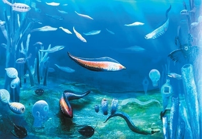 然而,在距今5.6億—5.18億年前的大約4200萬年間,發(fā)生了整個(gè)生命史上最為壯觀的生物創(chuàng)新事件——寒武紀(jì)大爆發(fā),即在不到地球歷史1%的時(shí)間內(nèi)誕生了90%的動物門類。大量的動物化石為追溯動物進(jìn)化和人類遠(yuǎn)祖提供了重要標(biāo)本。前面提到的鳳姣昆明魚,就生活在寒武紀(jì)大爆發(fā)巔峰時(shí)期。