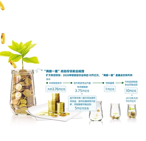 為重點(diǎn)支持既促消費(fèi)惠民生又調(diào)結(jié)構(gòu)增后勁的“兩新一重”建設(shè),根據(jù)《政府工作報(bào)告》,今年特別安排地方政府專項(xiàng)債券3.75萬億元,比2019年有所增加;另有抗疫特別國債1萬億元,資金用途共涉及6個(gè)領(lǐng)域,其中有部分也指向“兩新一重”建設(shè)領(lǐng)域。