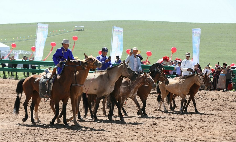 文藝演出結(jié)束后,進(jìn)行了傳統(tǒng)的那達(dá)慕賽事項(xiàng)目。賽馬場(chǎng)上群馬奔騰、塵土飛揚(yáng),場(chǎng)面蔚為壯觀,騎手們揚(yáng)鞭策馬,展現(xiàn)出精湛的騎術(shù),贏得觀眾陣陣歡呼。摔跤場(chǎng)上,搏克手你來我往互不相讓,斗智斗勇……