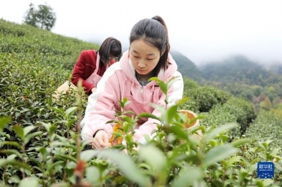 3月21日,茶農(nóng)在貴州省綏陽縣小關鄉(xiāng)大寨村的茶園種植基地里采茶。