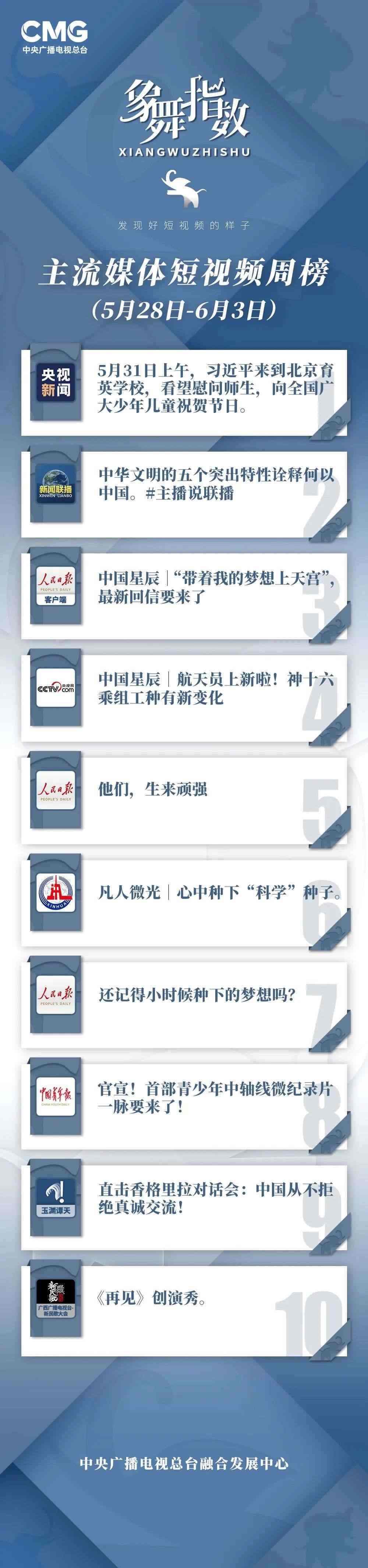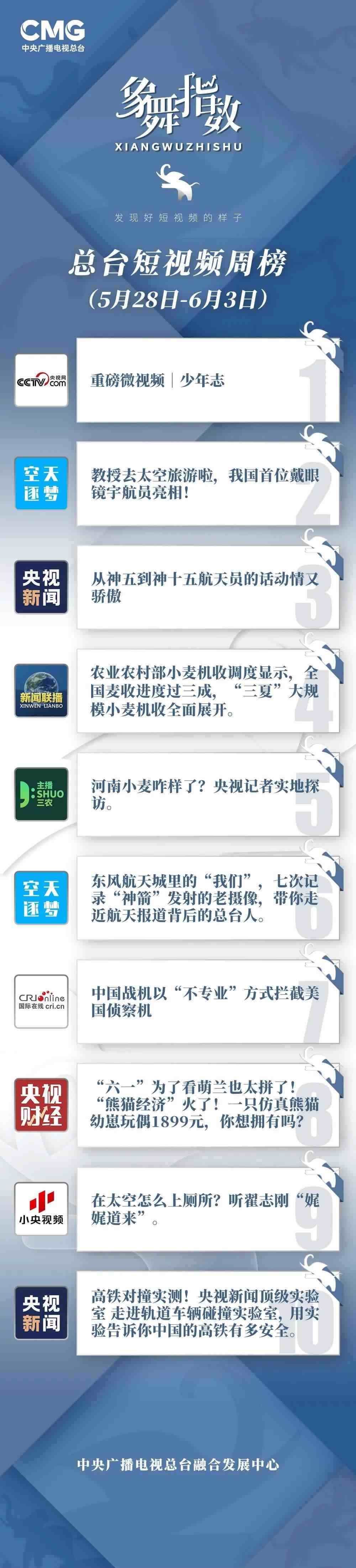 中央廣播電視總臺(tái)“象舞指數(shù)”評(píng)議品牌,推出主流媒體短視頻周榜、總臺(tái)短視頻周榜。在2023年5月28日—6月3日,這些內(nèi)容引發(fā)大眾關(guān)注: