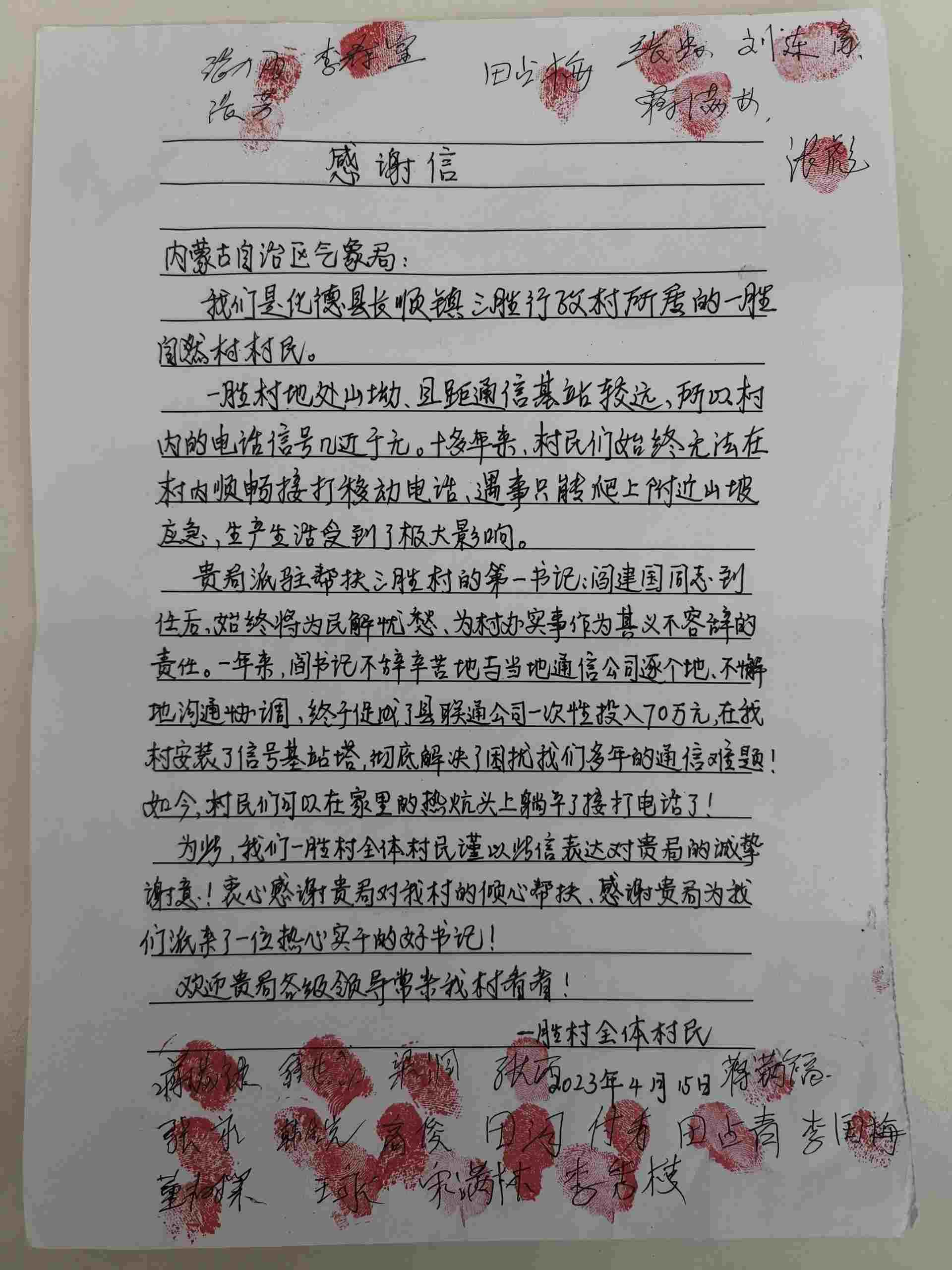 近日,一封署名為“一勝村全體村民”的感謝信,被專程送至內(nèi)蒙古氣象局,信紙上的空白處簽滿了24個(gè)名字,還有一枚枚鮮紅的指印,這封信承載著烏蘭察布市化德縣一勝村16戶村民對駐村第一書記閻建國的誠摯謝意。