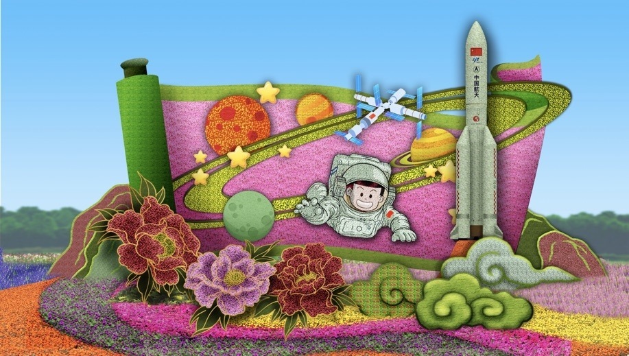 10,復(fù)興門東北角的“筑夢未來”花壇頂高8.5米,以中國航天員、空間站為主景,寓意航天強國建設(shè)蓬勃發(fā)展,助力中國夢早日實現(xiàn),全面推進中華民族偉大復(fù)興,譜寫新時代中國特色社會主義更加絢麗的華章。