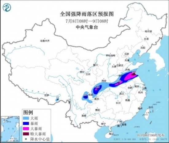 全國強降水落區(qū)預(yù)報(7月8日08時-9日08時)