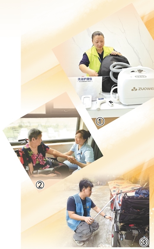 圖①:老年助浴員肖琳在店里收拾設備,準備上門為老人助浴。冷智梅攝 圖②:健康照護師劉馳在為耿守愛老人進行護理。本報記者 朱佩嫻攝 圖③:適老化改造評估師鐘晉軒在測量曾炳成老人的輪椅扶手高度。本報記者 洪秋婷攝