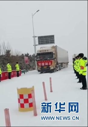 2月14日,內(nèi)蒙古多地普降大雪,從赤峰出發(fā)的運(yùn)輸車輛,在當(dāng)?shù)亟痪淖o(hù)送下順利踏上征途。沿途的交警列隊(duì)敬禮,目送車隊(duì)離去。