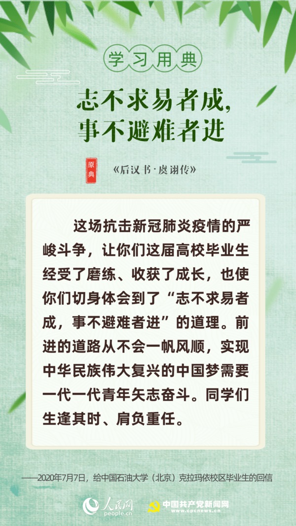 【編者按】“志不求易者成,事不避難者進?!苯眨暯娇倳浗o中國石油大學(北京)克拉瑪依校區(qū)畢業(yè)生回信,對廣大高校畢業(yè)生提出殷切期望。“人生在勤,勤則不匱”“積土而為山,積水而為?!薄陙?,習近平多次引用詩句典故,激勵包含廣大青年在內(nèi)的全黨全國各族人民拼搏奮進、埋頭苦干。正值“戰(zhàn)疫”“戰(zhàn)貧”關(guān)鍵時刻,人民網(wǎng)·中國共產(chǎn)黨新聞網(wǎng)與您一起回顧習近平講話中關(guān)于“奮斗”的10個名句。