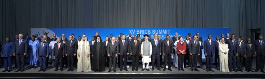 會(huì)議由南非總統(tǒng)拉馬福薩主持,巴西總統(tǒng)盧拉、印度總理莫迪、俄羅斯總統(tǒng)普京(線上)和60多位非洲國(guó)家及其他新興市場(chǎng)和發(fā)展中國(guó)家領(lǐng)導(dǎo)人或代表,以及聯(lián)合國(guó)秘書長(zhǎng)古特雷斯、新開發(fā)銀行行長(zhǎng)羅塞夫等國(guó)際和地區(qū)組織負(fù)責(zé)人出席。這是與會(huì)領(lǐng)導(dǎo)人集體合影。新華社記者 李學(xué)仁 攝