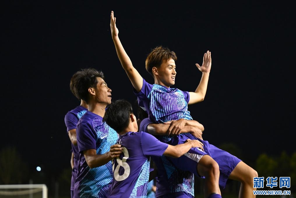 ??6月15日,天津津門虎U21隊球員王忠民(右一)在比賽中與隊友慶祝進球。