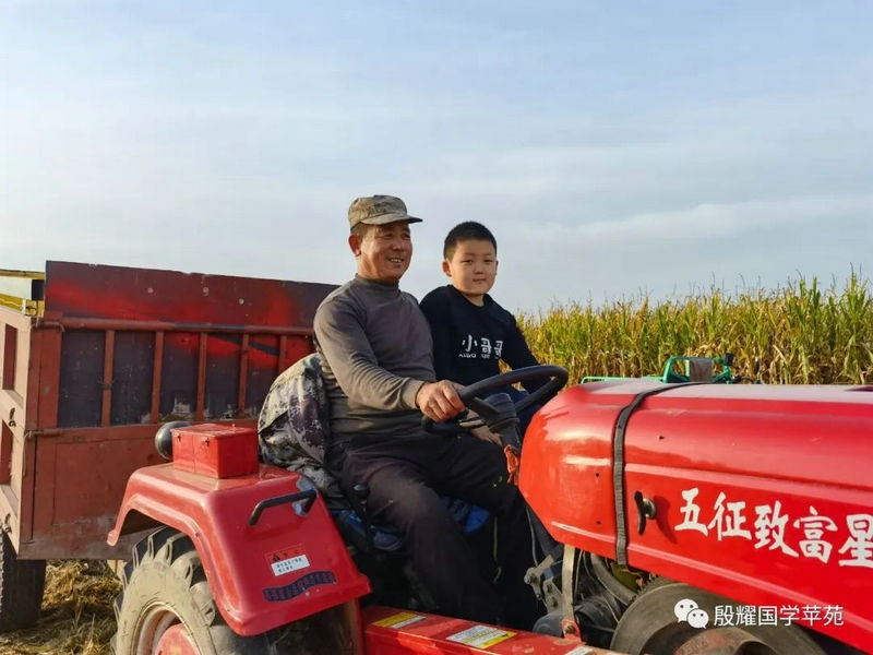 父親讓曈曈接地氣的愿望實現(xiàn)了,長得越來越壯實的曈曈真是打心眼喜歡上了農(nóng)村,喜歡看叔叔大爺們是如何勞動的。春天澆地的時候,他跟上我的發(fā)小利利到地里去,手里拿上一張鐵鍬學(xué)著去攏堰堤;秋收的時候他爬上了丁補(bǔ)元駕駛的收割機(jī),感受農(nóng)民們收割玉米的喜悅;接羔的時候,他又鉆進(jìn)利軍家的羊群里,抱著出生沒有幾天的小羊羔,給小羊羔喂牛奶……春節(jié)前的一兩天是他最忙的時候:一會跟上大爹貼春聯(lián),一會跟上茹義大爺掛紅燈,忙得不亦樂乎。前一段時間回村里他又要跟上利軍大爺出村放羊去,又要跟上茹義大爺去種玉米,在城里他是見識不到這些的。