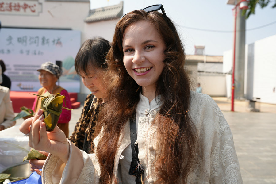 活動(dòng)現(xiàn)場(chǎng),粽香四溢,歡聲笑語(yǔ)此起彼伏。大家圍在一起,捋粽葉、填糯米、扎絲線,共同體驗(yàn)包粽子的傳統(tǒng)習(xí)俗。手法嫻熟的村民手把手教授外國(guó)友人包粽子的技巧,不一會(huì)兒,一個(gè)個(gè)形態(tài)各異的粽子便擺滿了桌。來(lái)自烏克蘭的留學(xué)生安吉麗娜學(xué)得格外認(rèn)真,她一邊模仿著村民的動(dòng)作,一邊忍不住贊嘆:“喜歡包粽子,粽子好吃!”言語(yǔ)間滿是對(duì)中國(guó)傳統(tǒng)美食的喜愛(ài)。