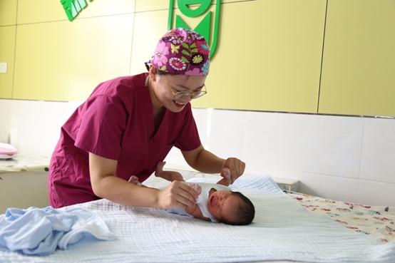 烏拉特前旗人民醫(yī)院護士為新生兒洗浴、撫觸。