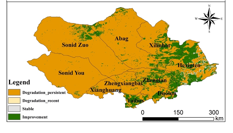 論文通訊作者王鋒研究員進(jìn)一步解釋說,該評估框架以16年為評價時段,間隔5年開展生態(tài)系統(tǒng)生態(tài)質(zhì)量評價。將2000-2015年的生態(tài)質(zhì)量作為參考基線,2005-2020年的生態(tài)質(zhì)量作為現(xiàn)狀,通過生態(tài)系統(tǒng)現(xiàn)狀質(zhì)量與參考基線質(zhì)量的比較開展評價。使用歸一化植被指數(shù)、土壤有機(jī)碳和沙塵暴三個指標(biāo)分別代表植被、土壤和大氣質(zhì)量,每個指標(biāo)變化包括提高、穩(wěn)定和退化3個水平。三個指標(biāo)通過邏輯運算而非權(quán)重計算獲得生態(tài)系統(tǒng)質(zhì)量指標(biāo)變化,兼顧了不同響應(yīng)速率指標(biāo)變化對生態(tài)系統(tǒng)質(zhì)量的影響。若三個指標(biāo)中有一項退化,生態(tài)質(zhì)量指標(biāo)即為退化。